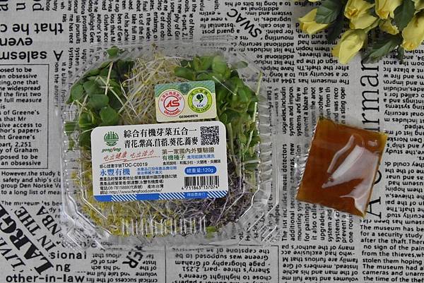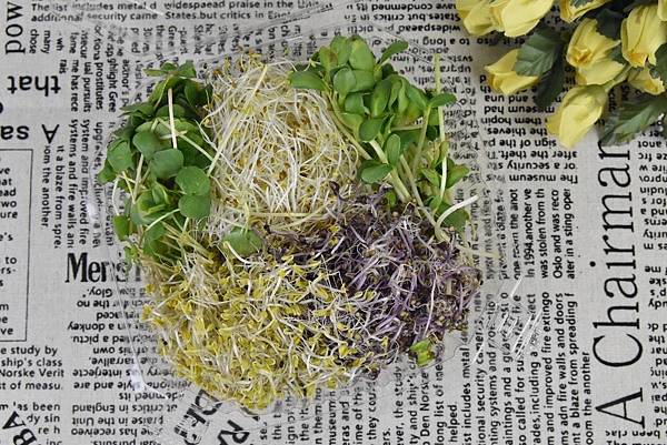 這款永豐的五合一有機蔬菜裡面有青花菜芽、紫高麗菜芽、苜蓿芽、葵花芽和蕎麥芽,這五種不同的芽菜都含有不同的營養秘密~而他們的共通點就是擁有高度的蘿蔔硫素、花青素、蛋白質、膳食纖維等等,對身體較有正面影響的營養素。